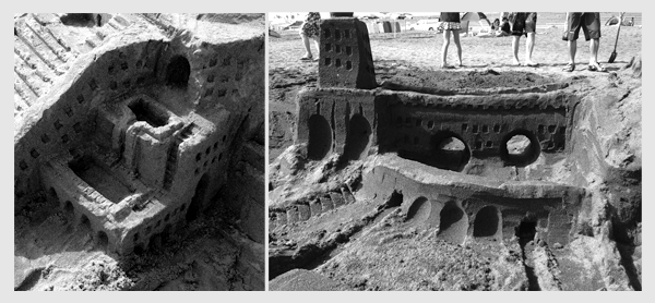 3時半を過ぎた頃、ついに城は完成。翼が張り出したため、かつてない大きさになった。高さでは2011年の「忘れられないBBQ大会」でつくった城(本サイトの「ある夏、あるイベントで…」を参照)に及ばないが、規模はこちらが上回っている。心配したトンネルもしっかりとできあがり、テルマエはいつも通り手が込んでいて美しい。藤崎親子が担当した後方では、T君が活躍。幸山副会長の指導のもとにダイナミックな大階段を仕上げた。その階段脇に、母のノンさんも素敵な「噴水」をつくり込み、これは新機軸。初参加者のフレッシュな感性が、こんなところに生かされた。